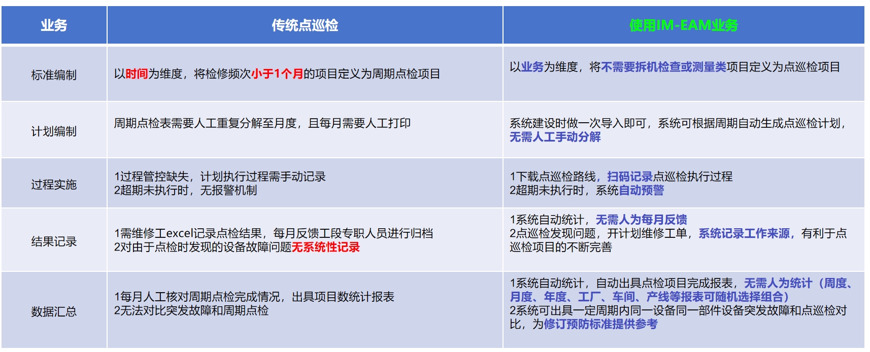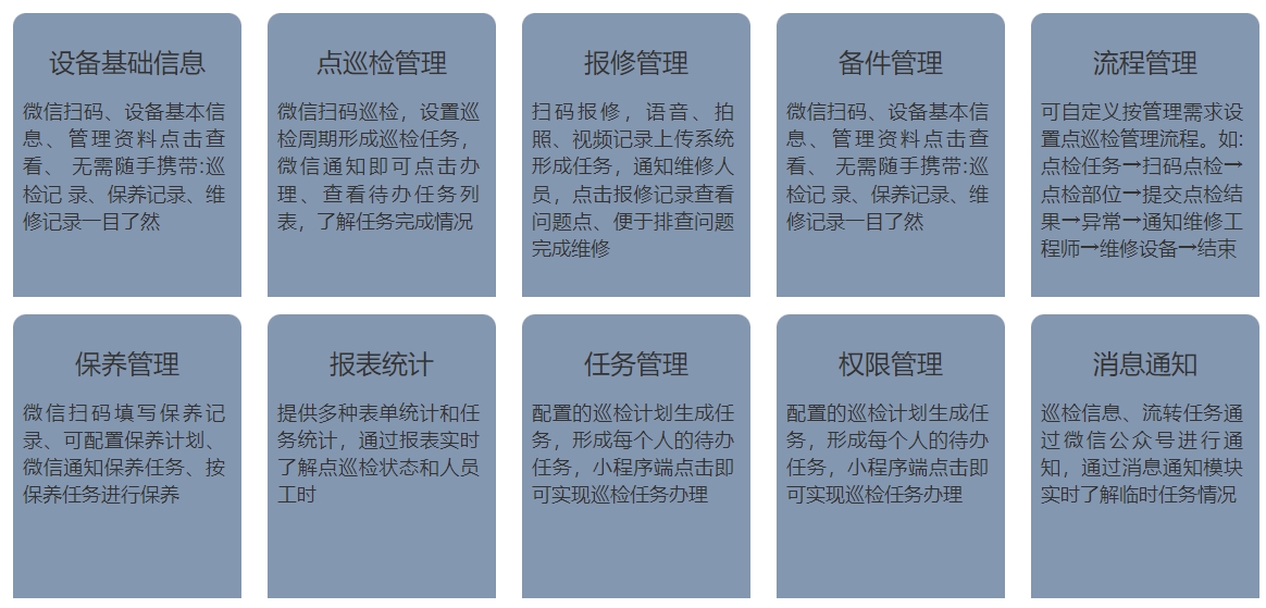 设备的点巡检是设备管理的基础工作,它是一种科学的设备管理办法,是利用人的感官或简单的仪表工具,按照标准定点、定期地对设备进行检查,找出设备的异状,发现隐患、掌握设备故障的初期信息,以便及时采取对策,将故障消灭在萌芽状态的一种管理办法。IM-EAM点巡检管理系统提供一物一码,一台手机就能查看最新档案;设备档案管理、报修、巡检、保养,全流程覆盖,随时监控;高效点检巡检,自定义提醒功能,确保工作有效执行,不被遗忘。工单记录备件去向库存信息一目了然。